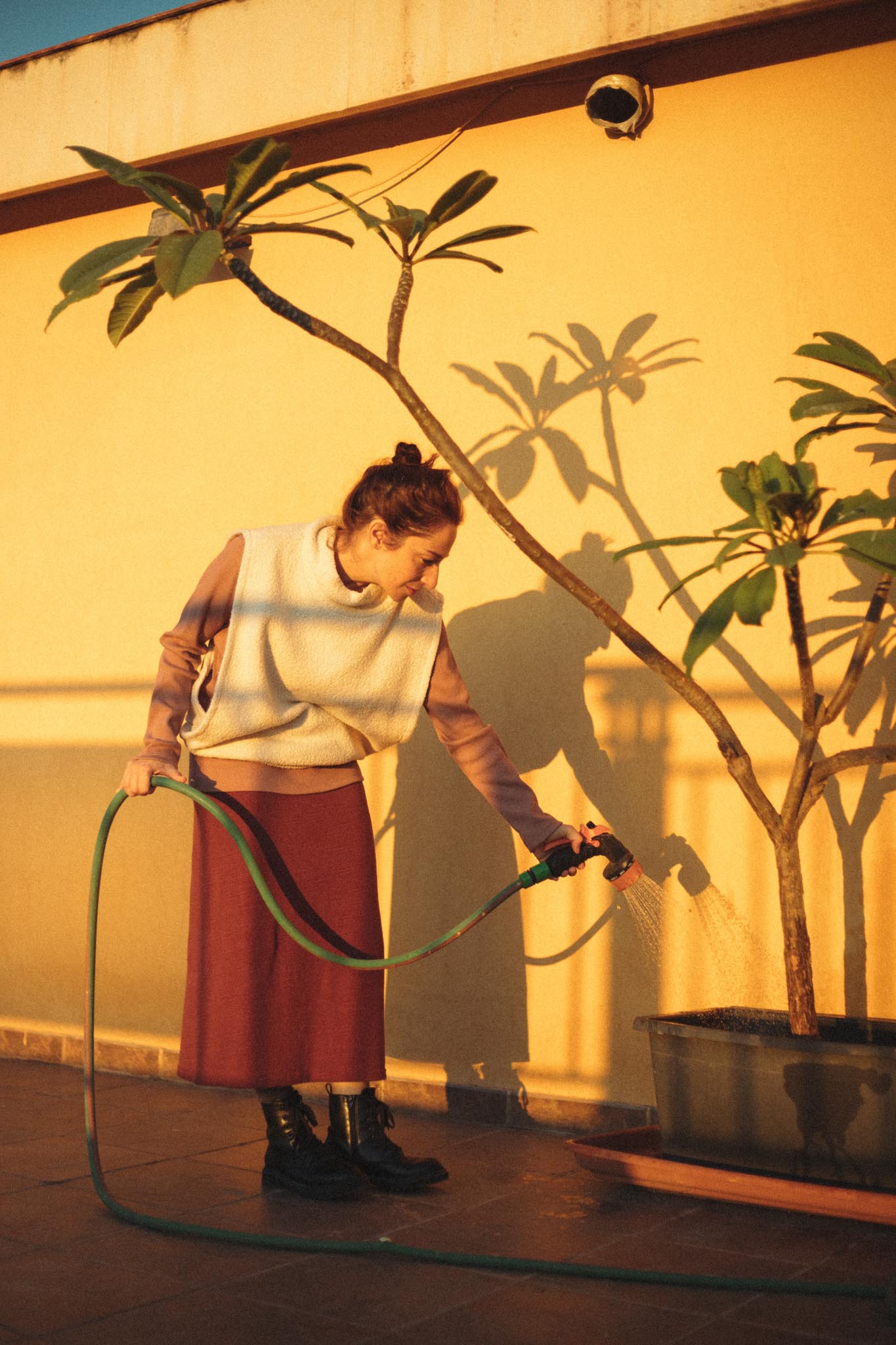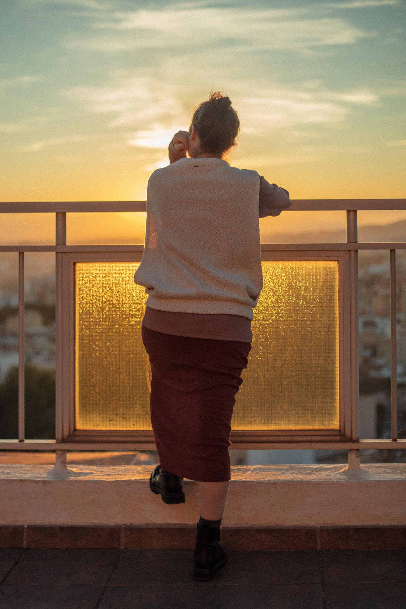 As the golden light settles over Malaga, the air is filled with a quiet calm on a terrace near Monte Victoria. The sun lingers just a little longer, casting a warm glow over Alicia as she tends to her plants, watering each one with mindful care. There's something soothing about the ritual of slowing down as the day drifts into evening.